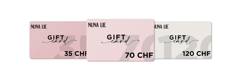 Puoi acquistare la nostra Gift Card Web sul sito scegliendo un importo tra 35, 70 e 120 CHF e chi la riceverà potrà usarla per tutti gli acquisti online sul sito www.nunalie.ch. Una volta acquistata, il mittente riceverà la conferma d'ordine e il destinatario del regalo riceverà una mail contentente il codice Gift Card da utilizzare per i suoi acquisti online. L’importo della Gift Card può essere speso su tutti i prodotti delle collezioni Nuna Lie, anche quelli in sconto, fino all’esaurimento dell’importo caricato.