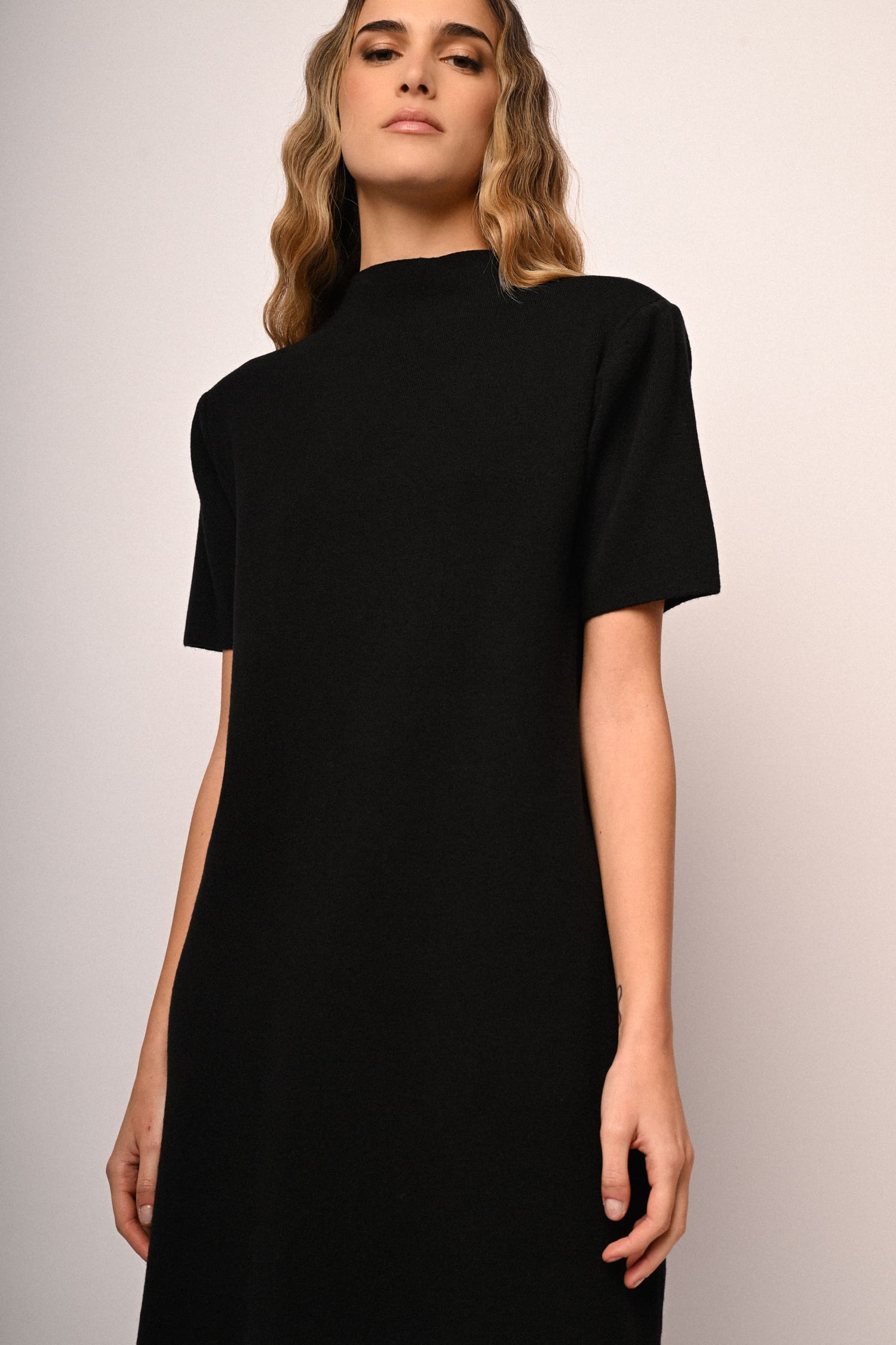 Abito corto in maglia misto viscosa nero con collo a lupetto, mezze maniche e taglio dritto.