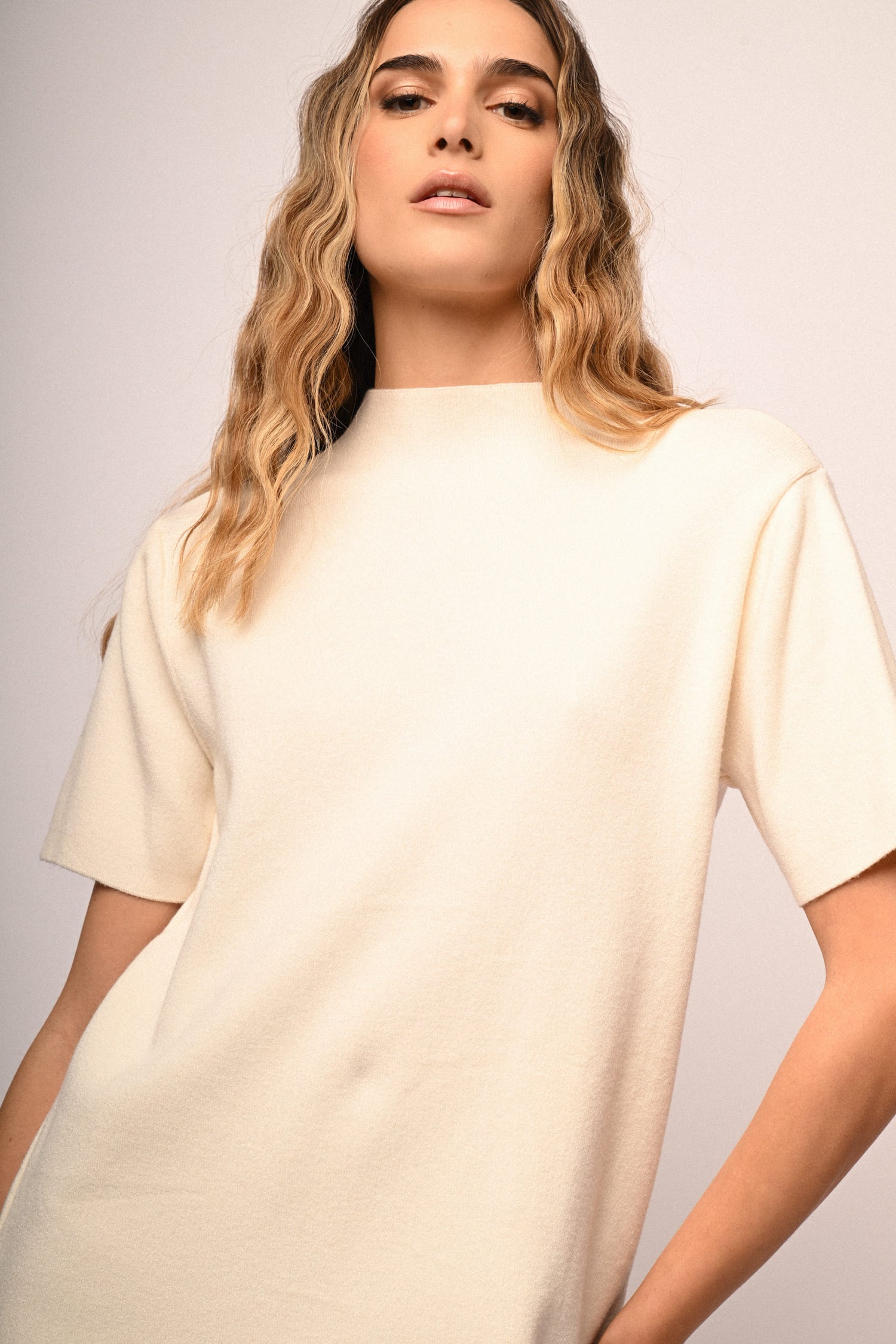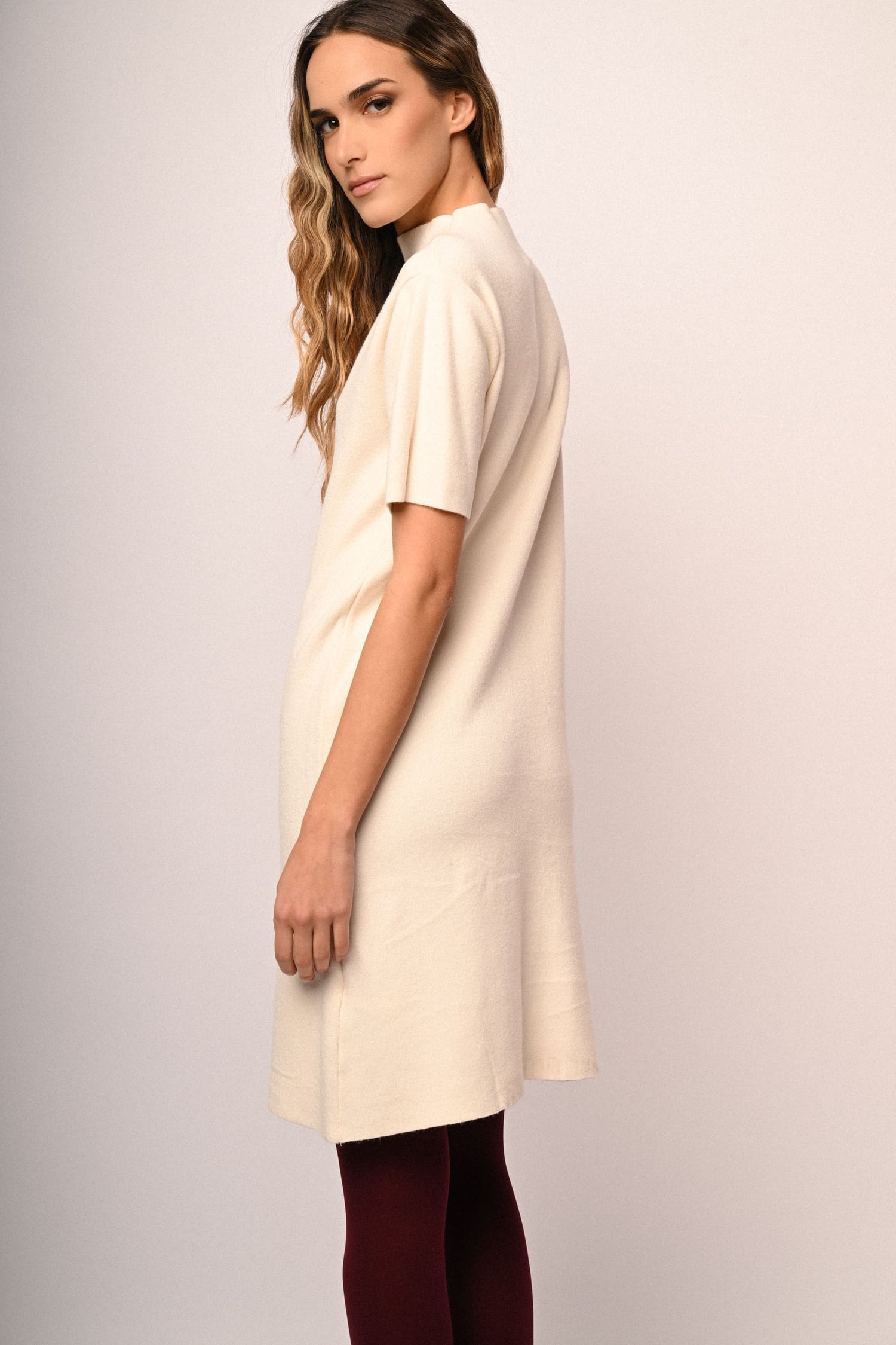 Abito corto in maglia misto viscosa avorio con collo a lupetto, mezze maniche e taglio dritto.