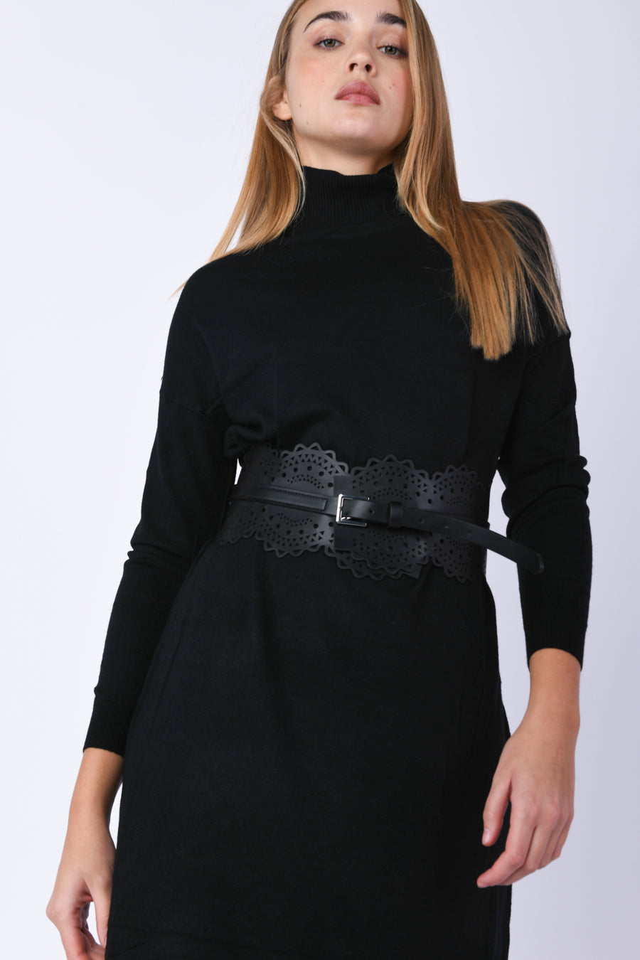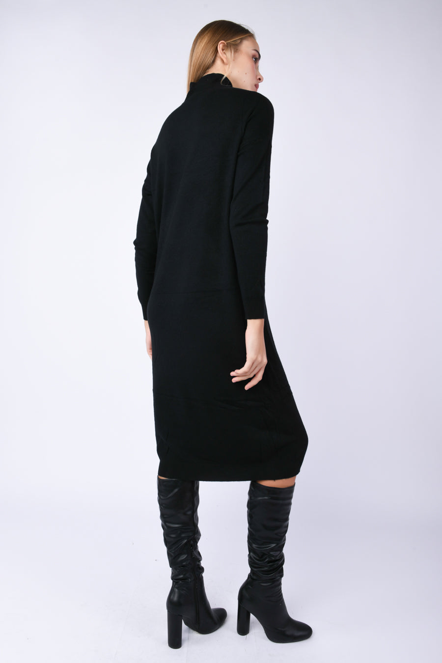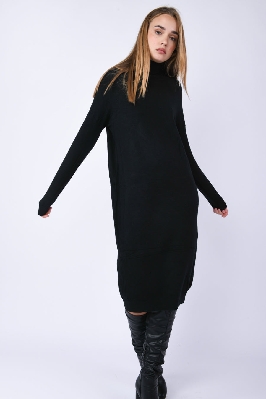 Abito midi oversize in maglia misto viscosa nera con collo a lupetto e finiture a costine.