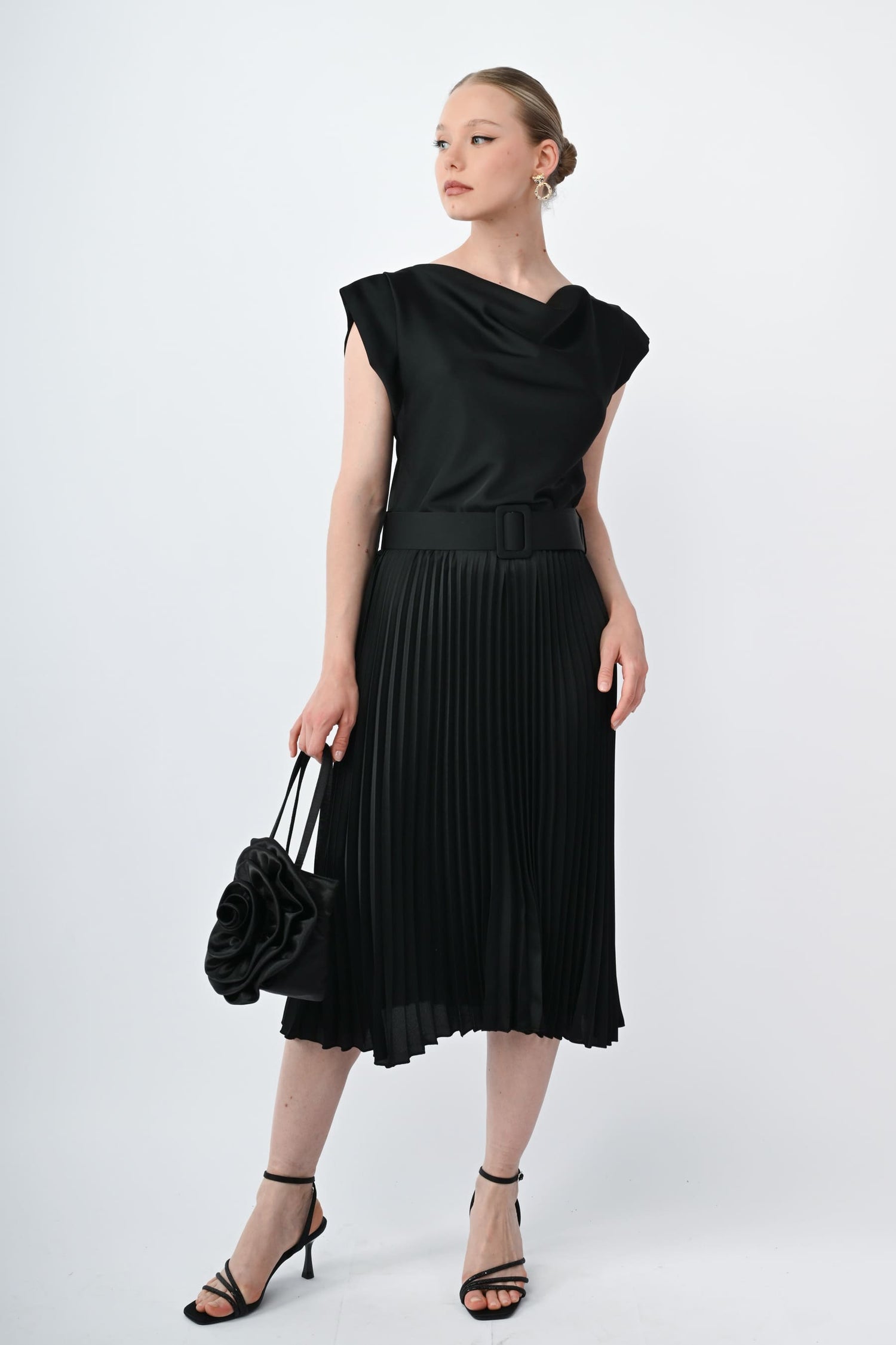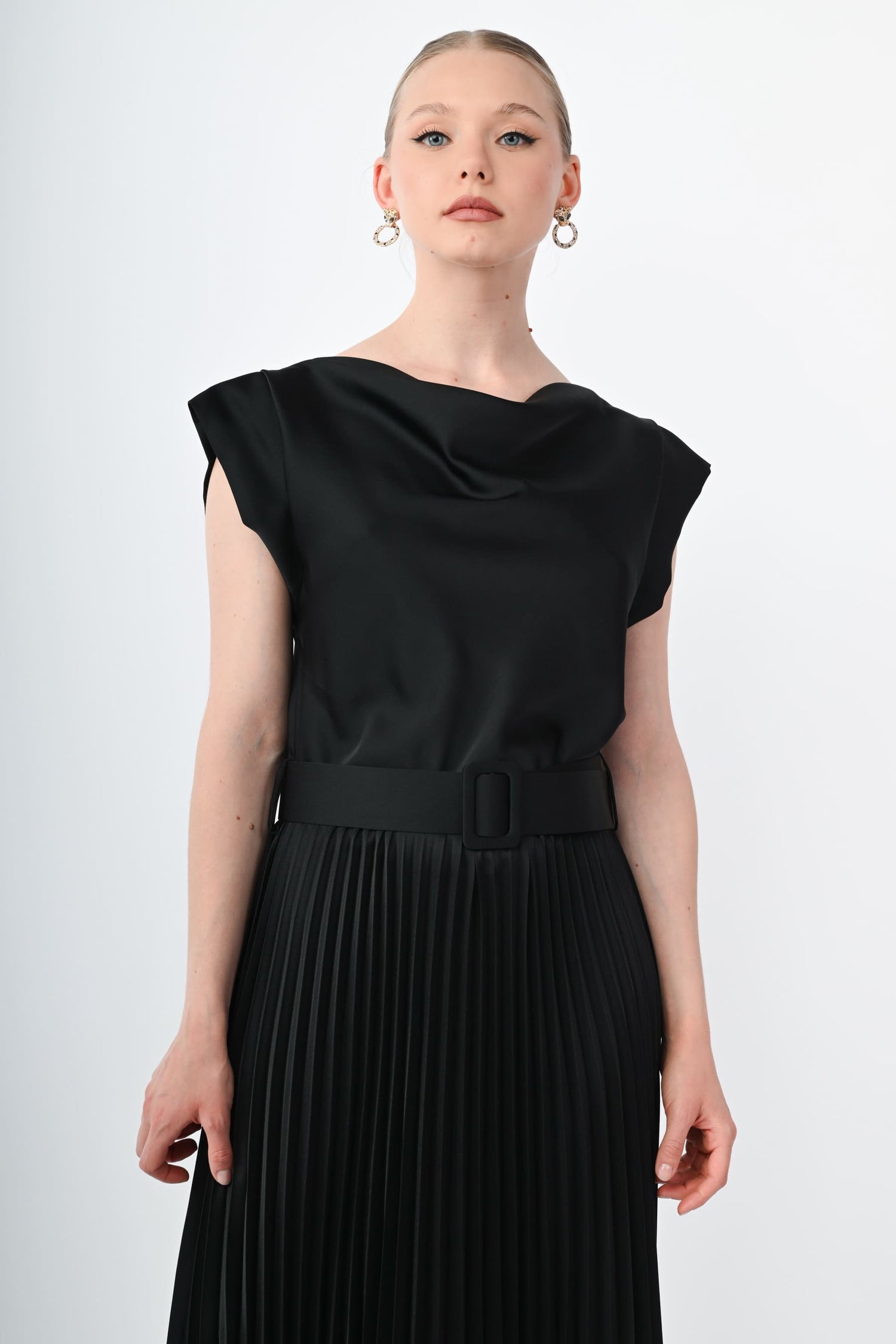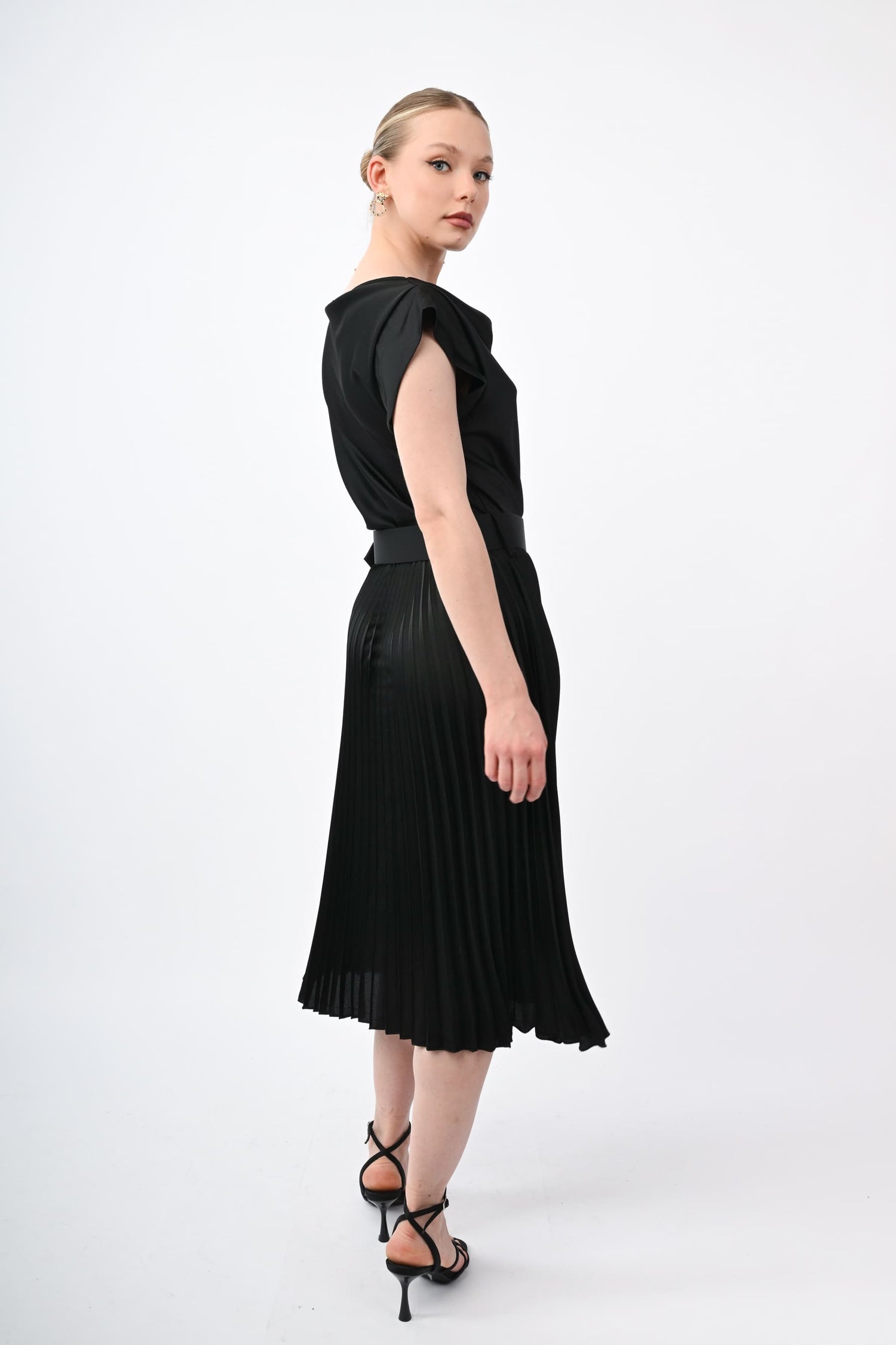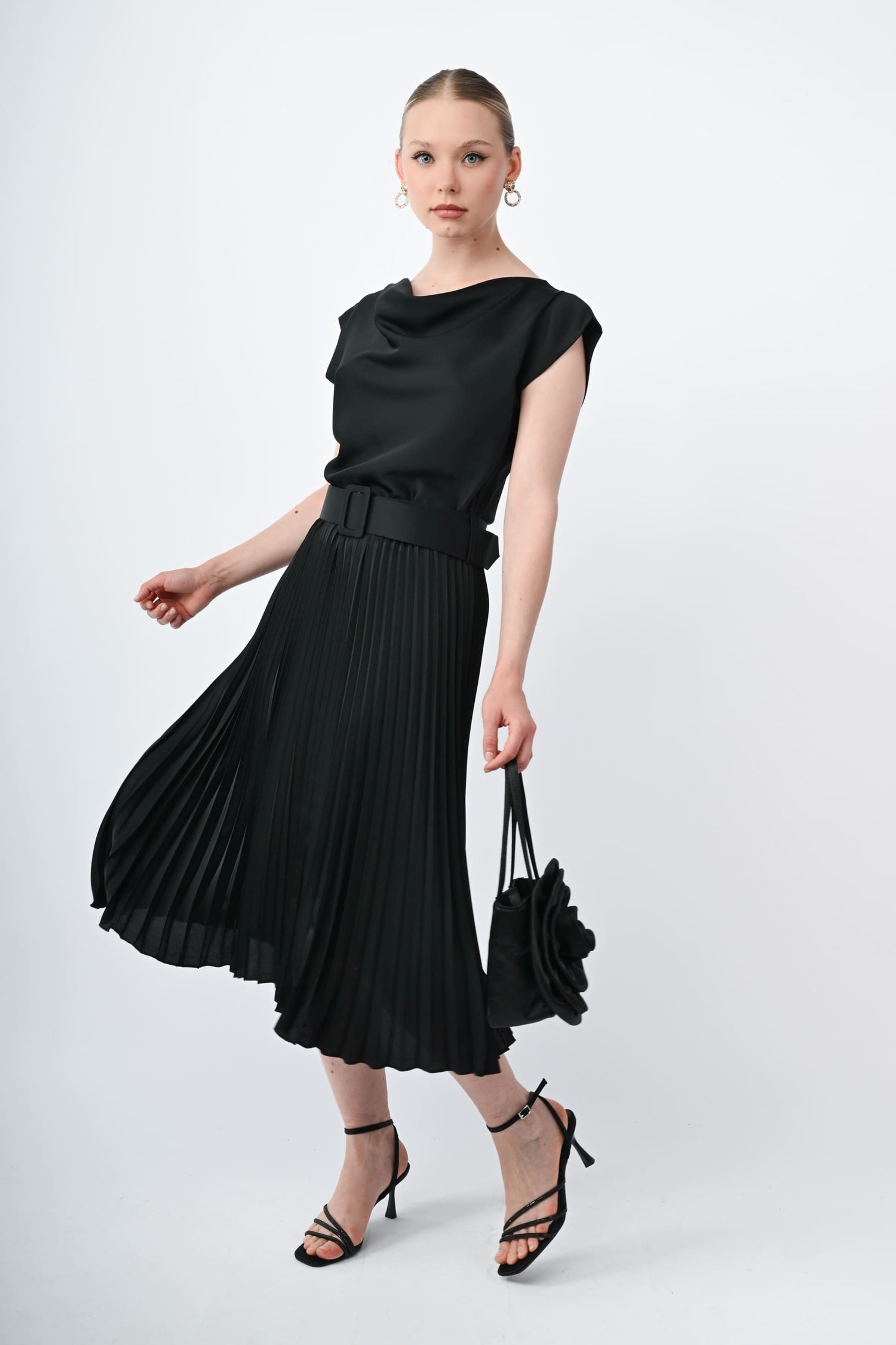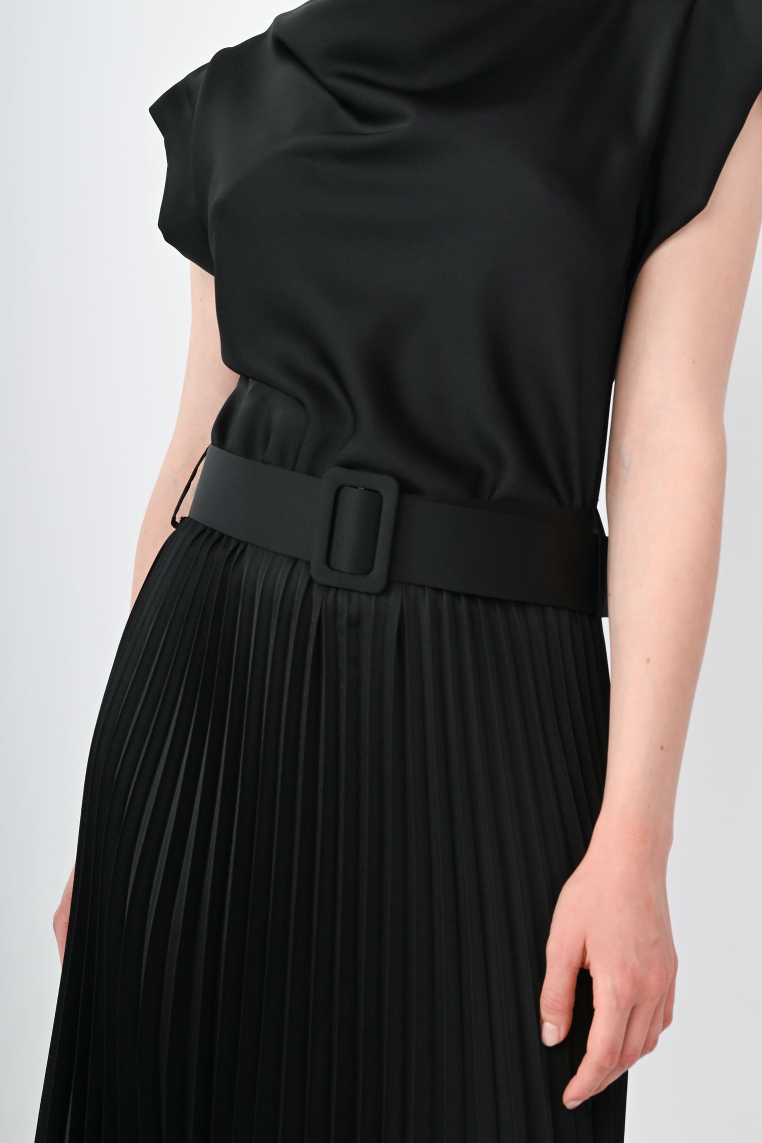 Abito midi in tessuto nero contraddistinto da top drappeggiato con scollo a barchetta e maniche ad aletta, cintura coordinata alla vita con fibbia rettangolare tono su tono e gonna plissettata.