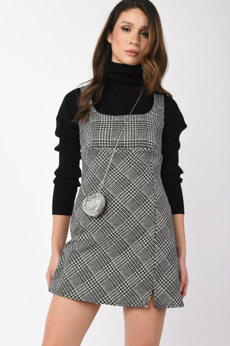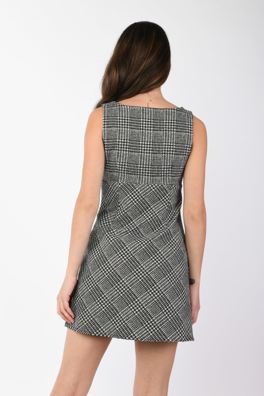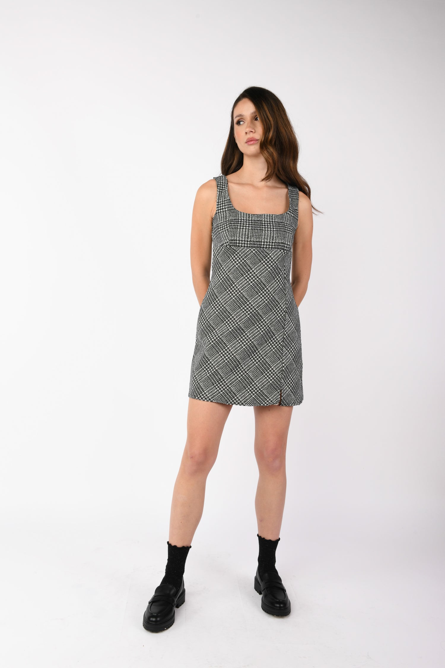 Mini abito in misto viscosa lurex a motivo Principe di Galles bianco e nero con scollo quadrato, taglio impero, chiusura con zip e spacchetto frontale.
