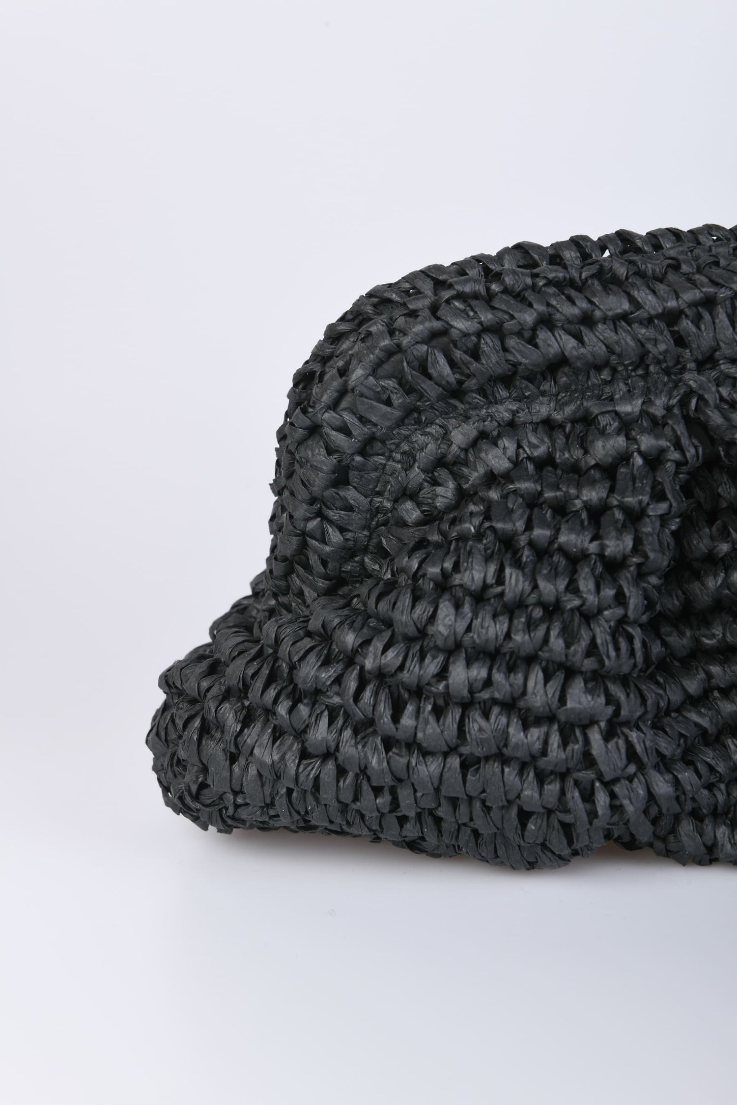 Pochette in rafia intrecciata nera con chiusura rigida e tracolla sottile a catenella rimovibile in metallo dorato.