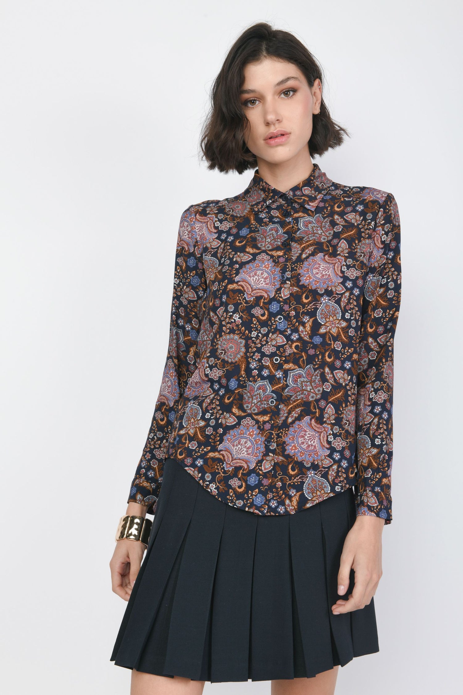 Camicia in viscosa a stampa etnica multicolor su fondo blu con colletto a punta, abbottonatura frontale e ai polsini e orlo stondato.