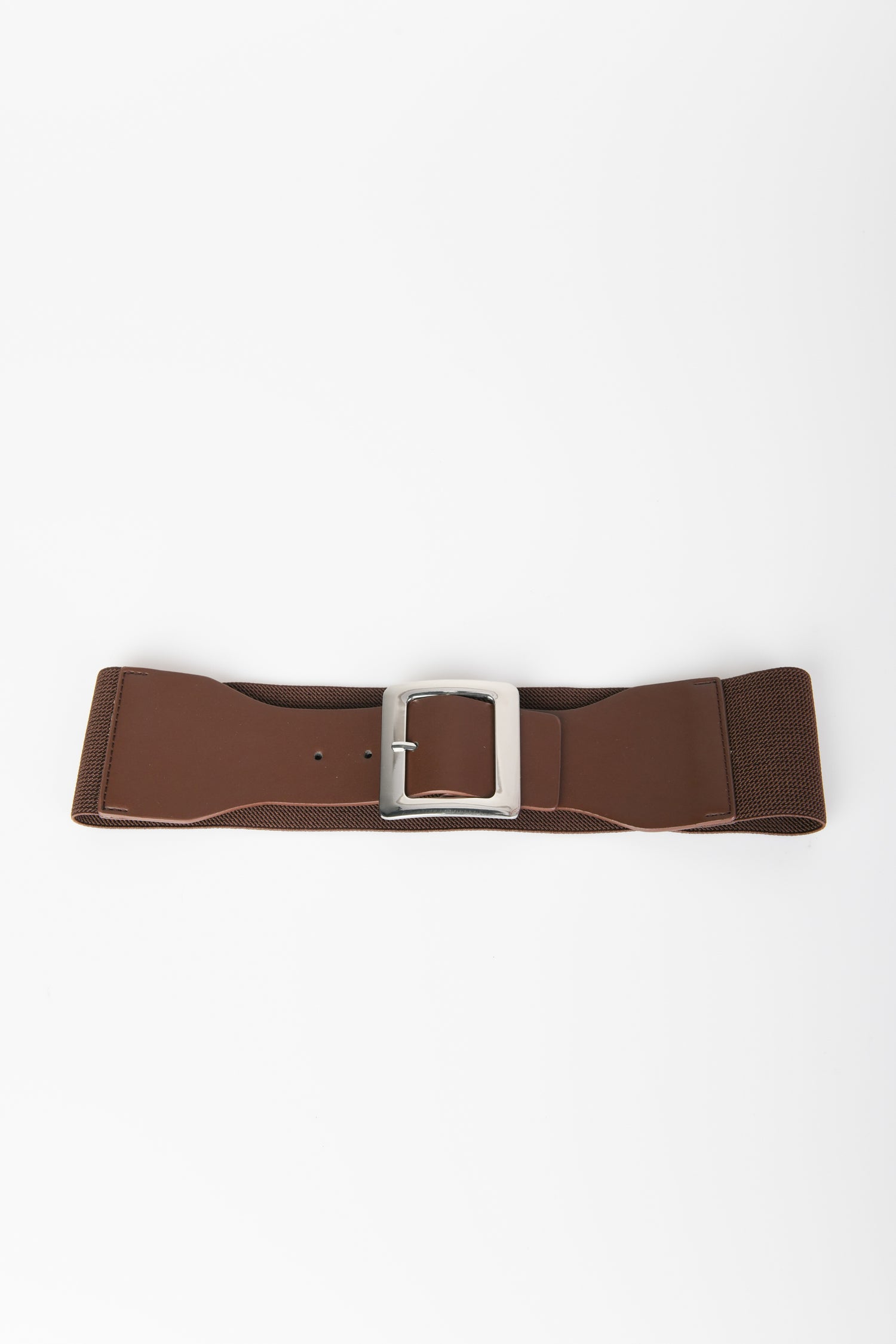 Cintura alta in tessuto elasticizzato e similpelle marrone con fibbia squadrata metallo argentato.