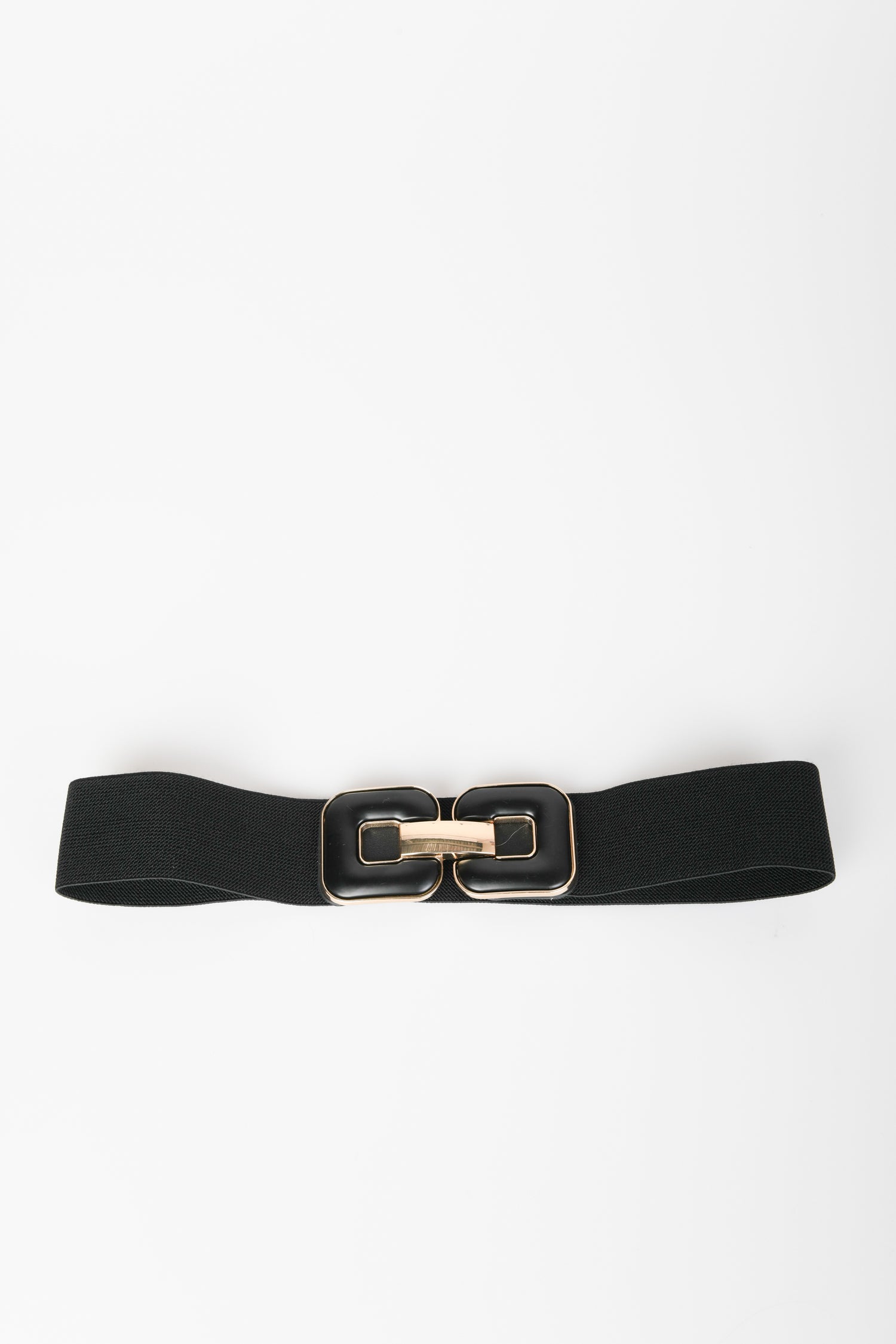 Cintura in tessuto elasticizzato nero con doppia fibbia in metallo dorato smaltato fucsia.