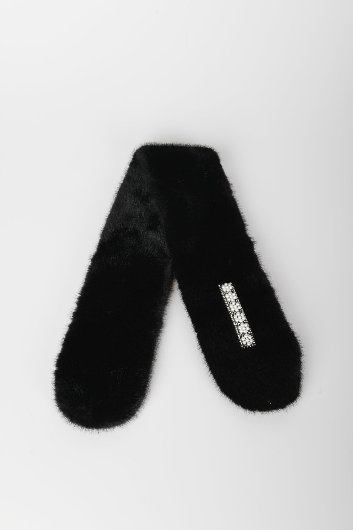 Sciarpa in similpelliccia nera con decorazione in perle e strass.