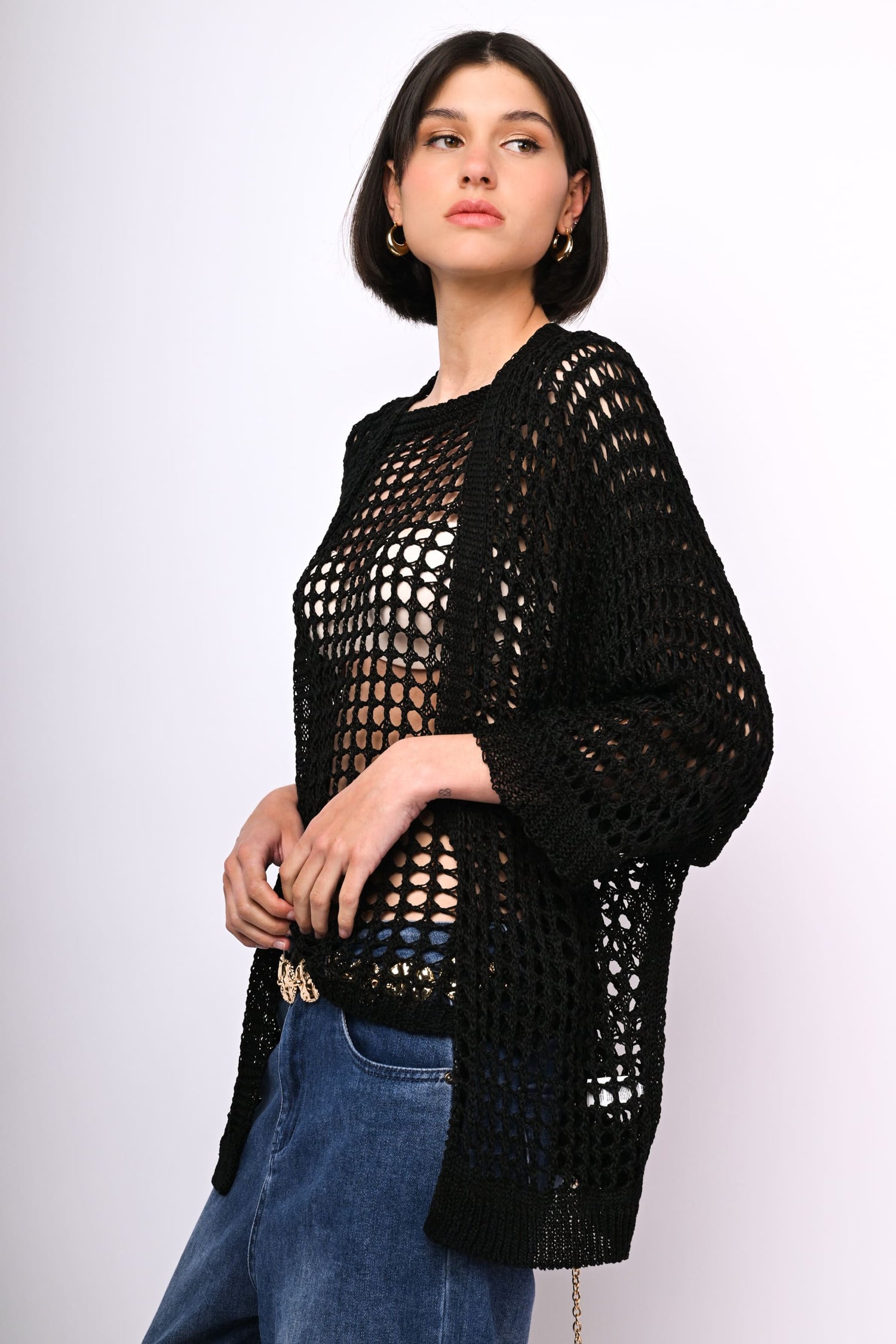 Cardigan lungo in maglia crochet nera senza chiusura e con maniche crop.