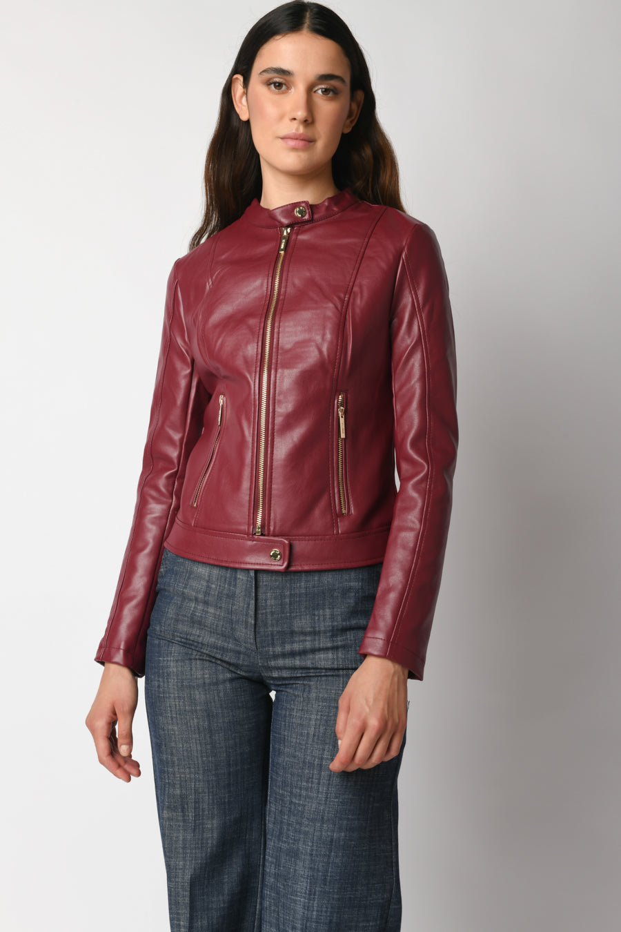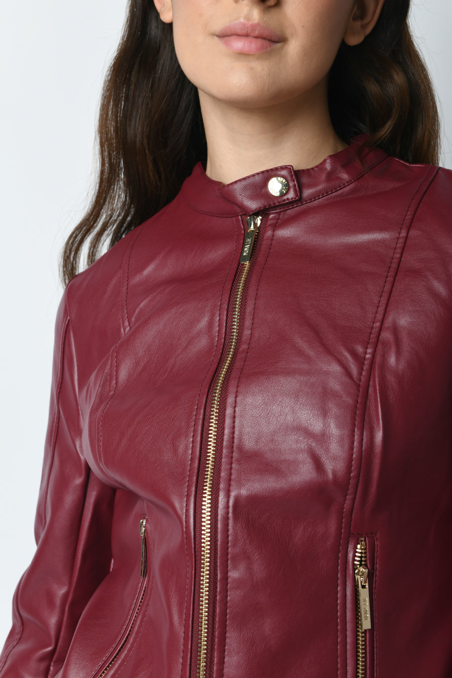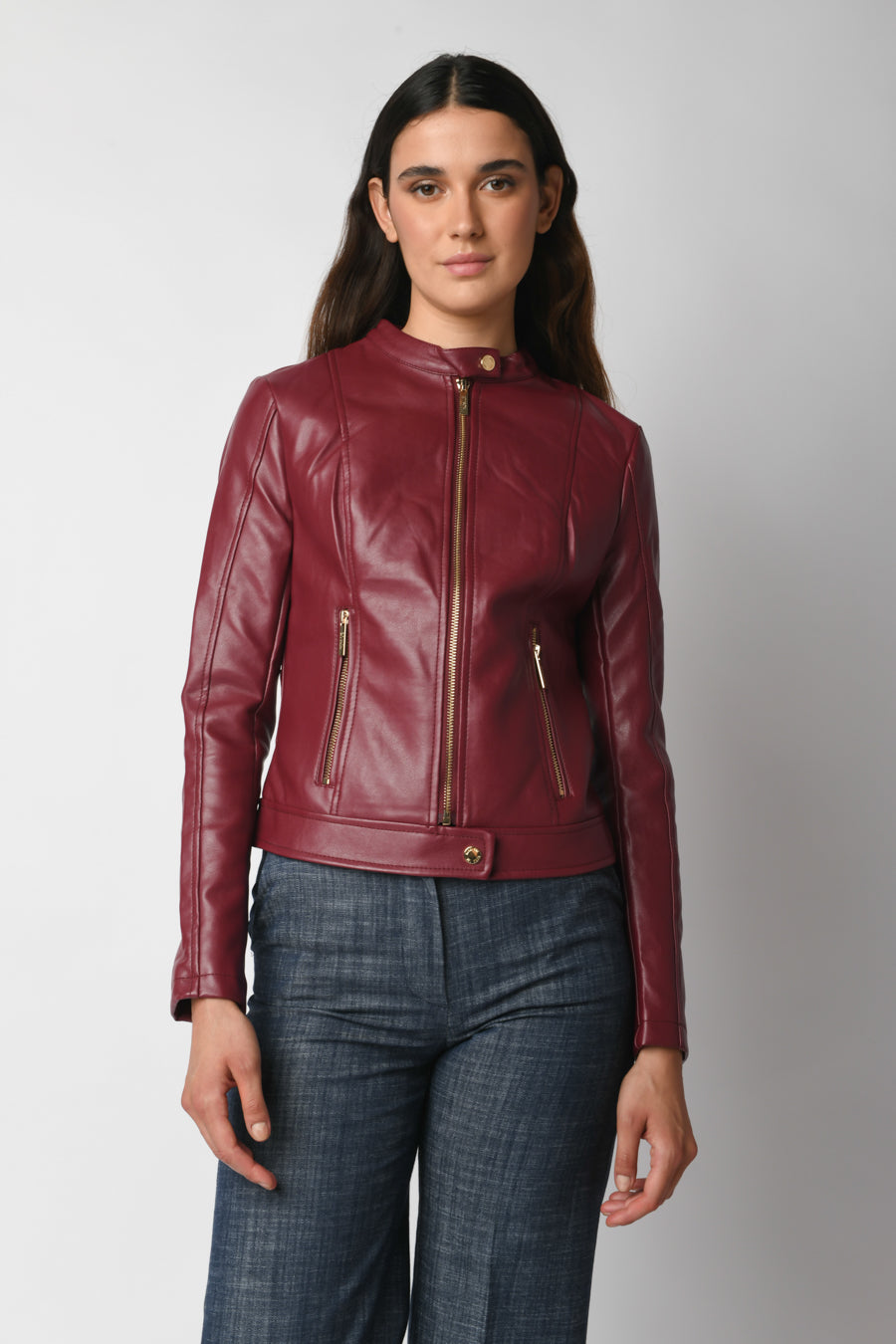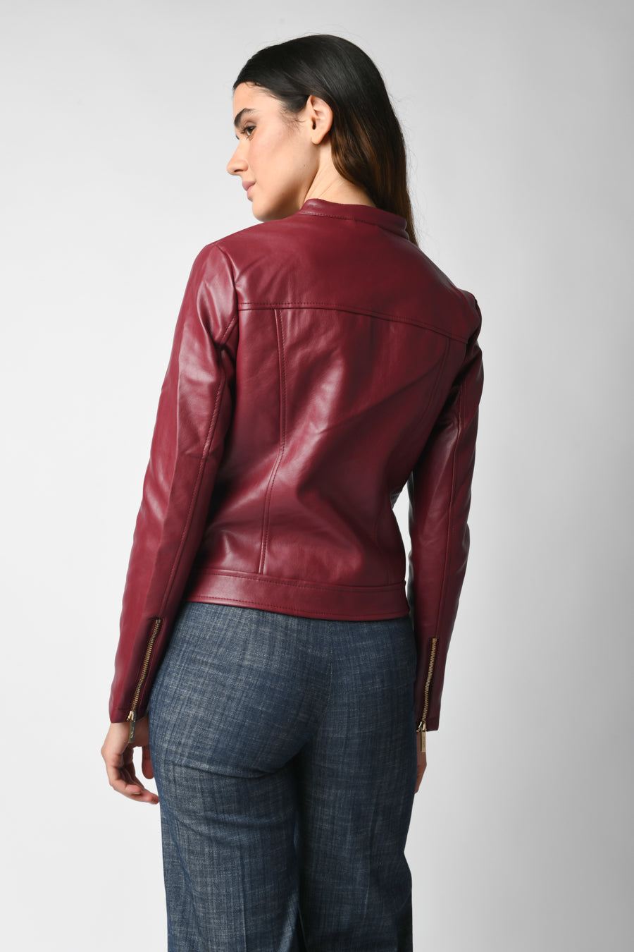 Giacca in similpelle bordeaux con scollo tondo e orlo chiusi da bottoni a pressione, zip frontale, tasche laterali chiuse da zip e polsini chiusi da zip.