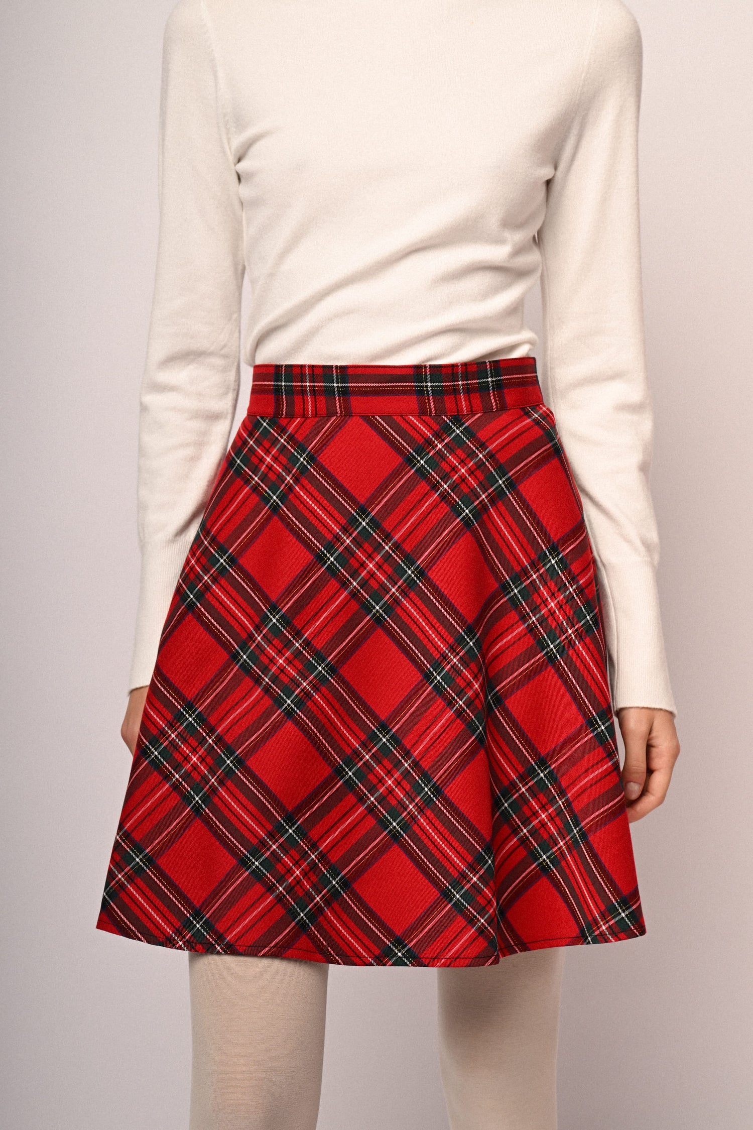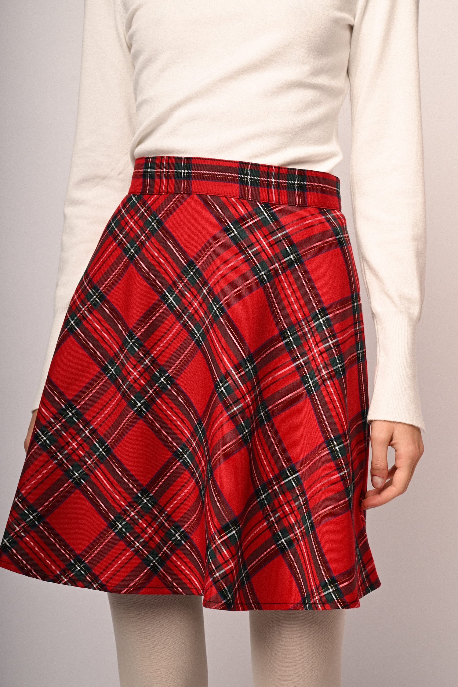 Minigonna a mezza ruota in misto viscosa stretch con motivo scozzese su fondo rosso, vita alta e chiusura con zip al centro dietro.