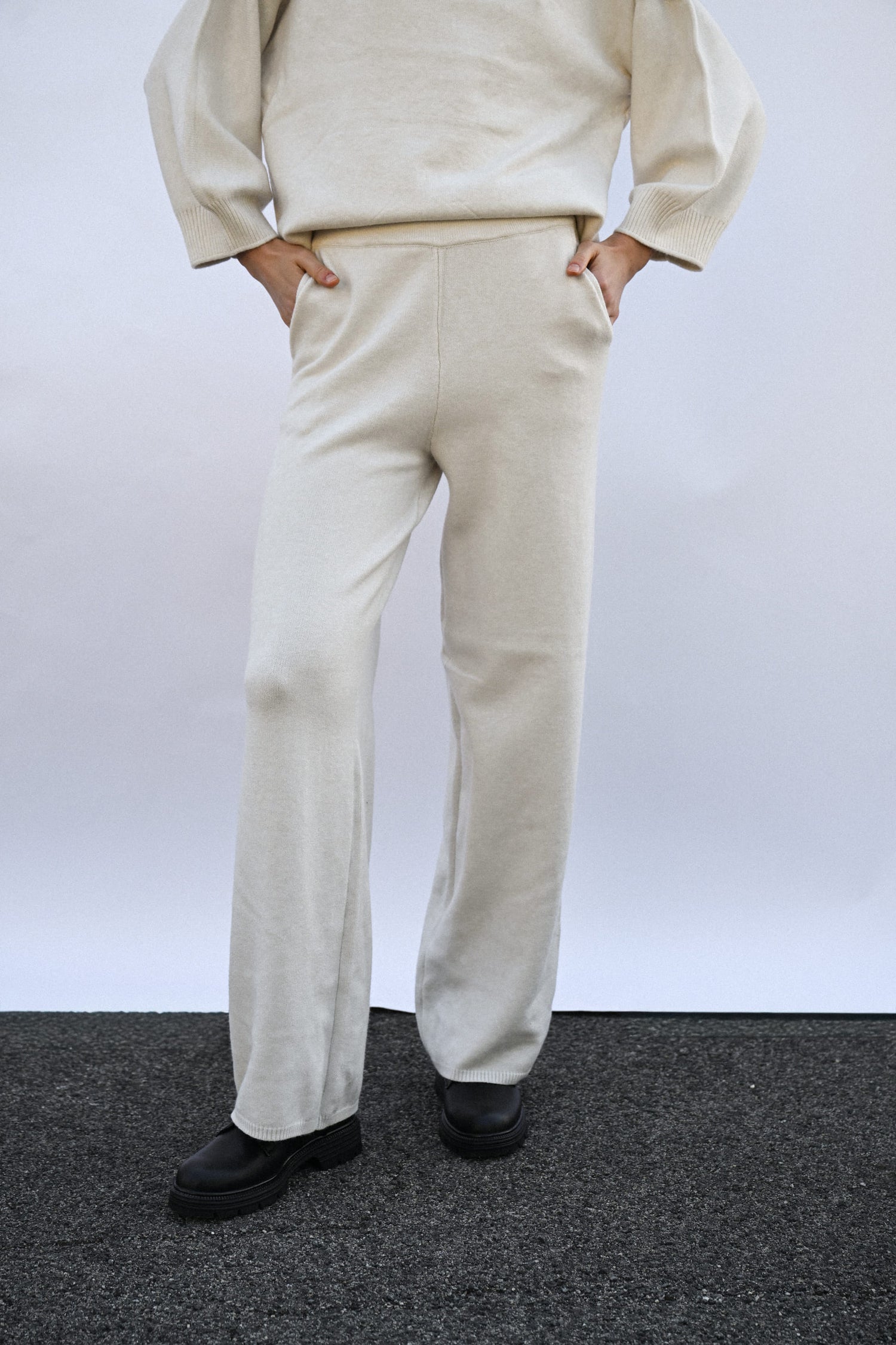 Pantaloni palazzo in maglia misto nylon avorio con vita elasticizzata a costine e tasche laterali.