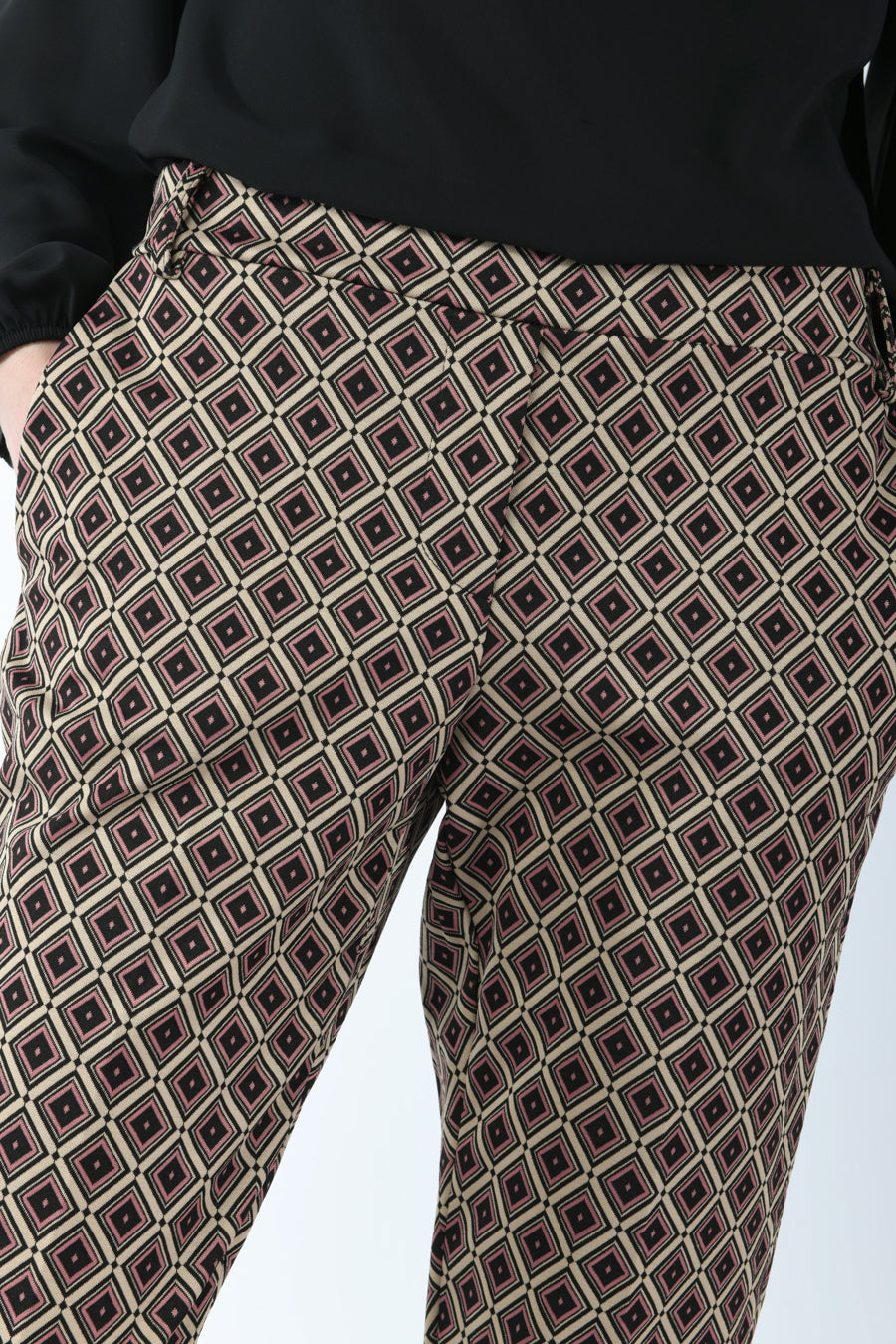 Pantaloni in tessuto stretch a stampa geometrica nei toni del beige, fucsia e nero con vita elasticizzata sul retro, tasche laterali e gamba dritta.