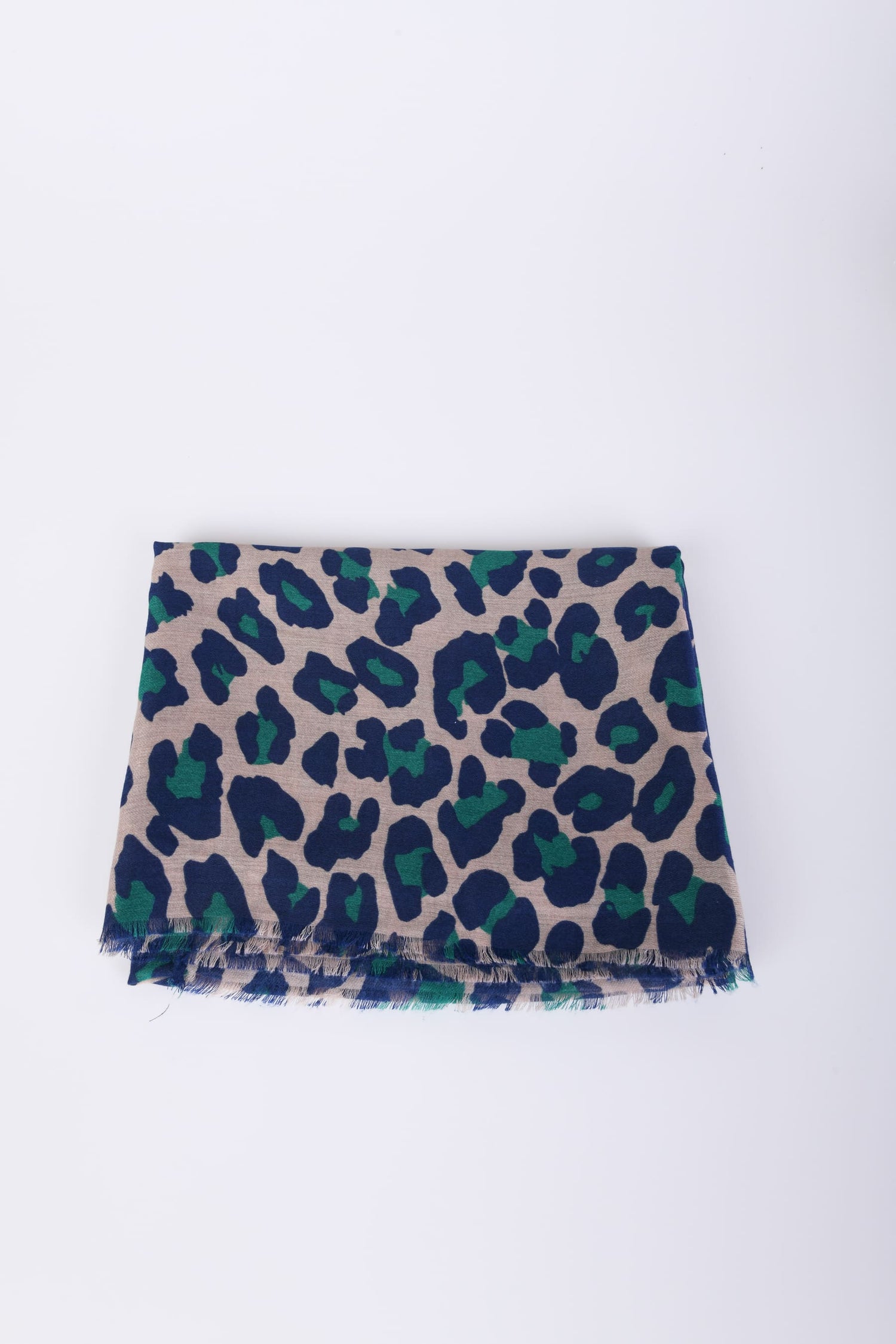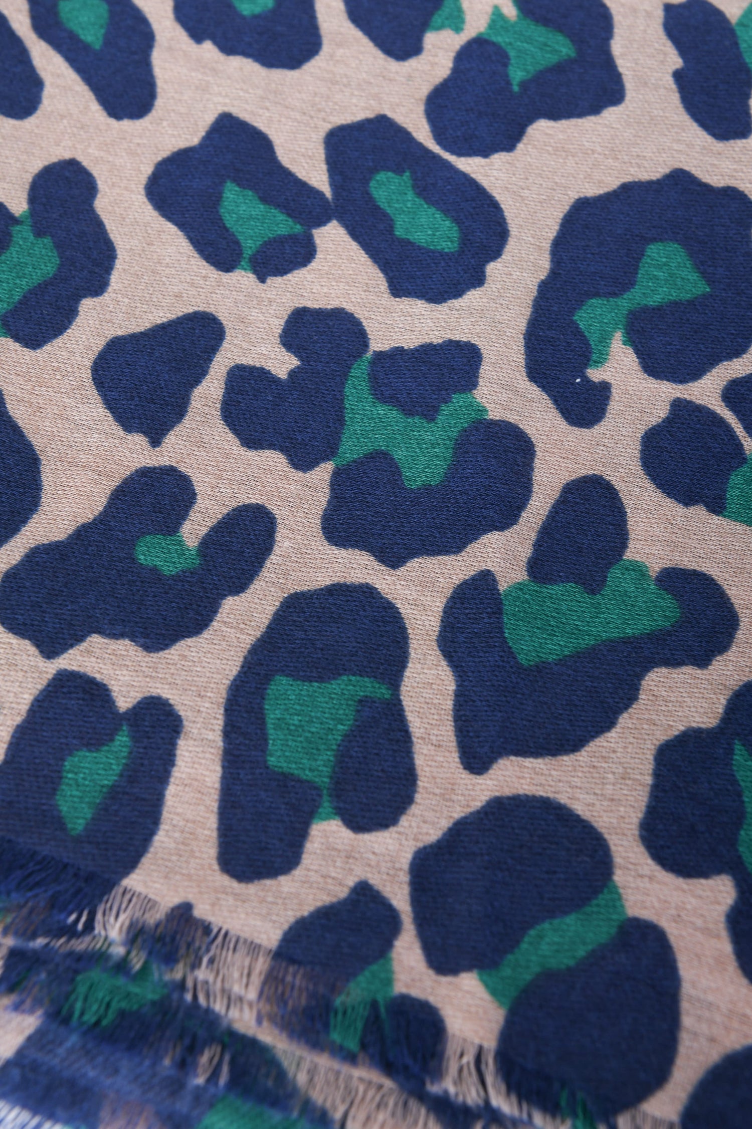Sciarpa a stampa leopardata nei toni del blu e verde su fondo beige con finiture sfrangiate.