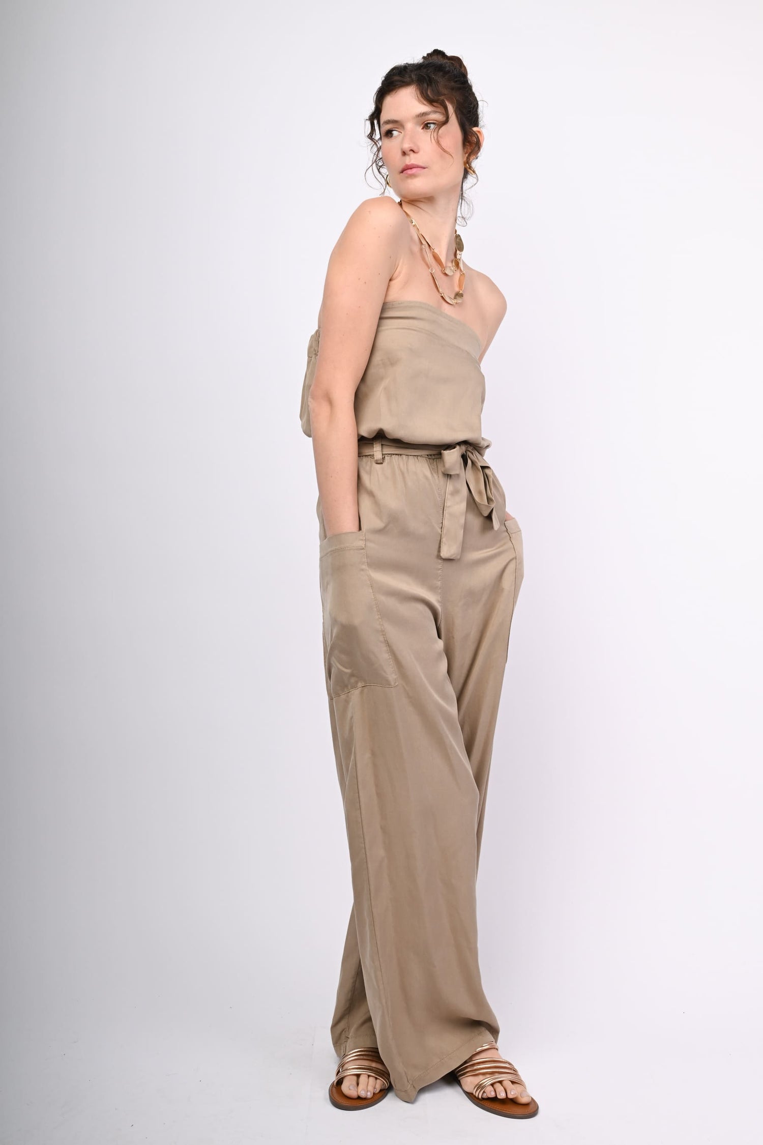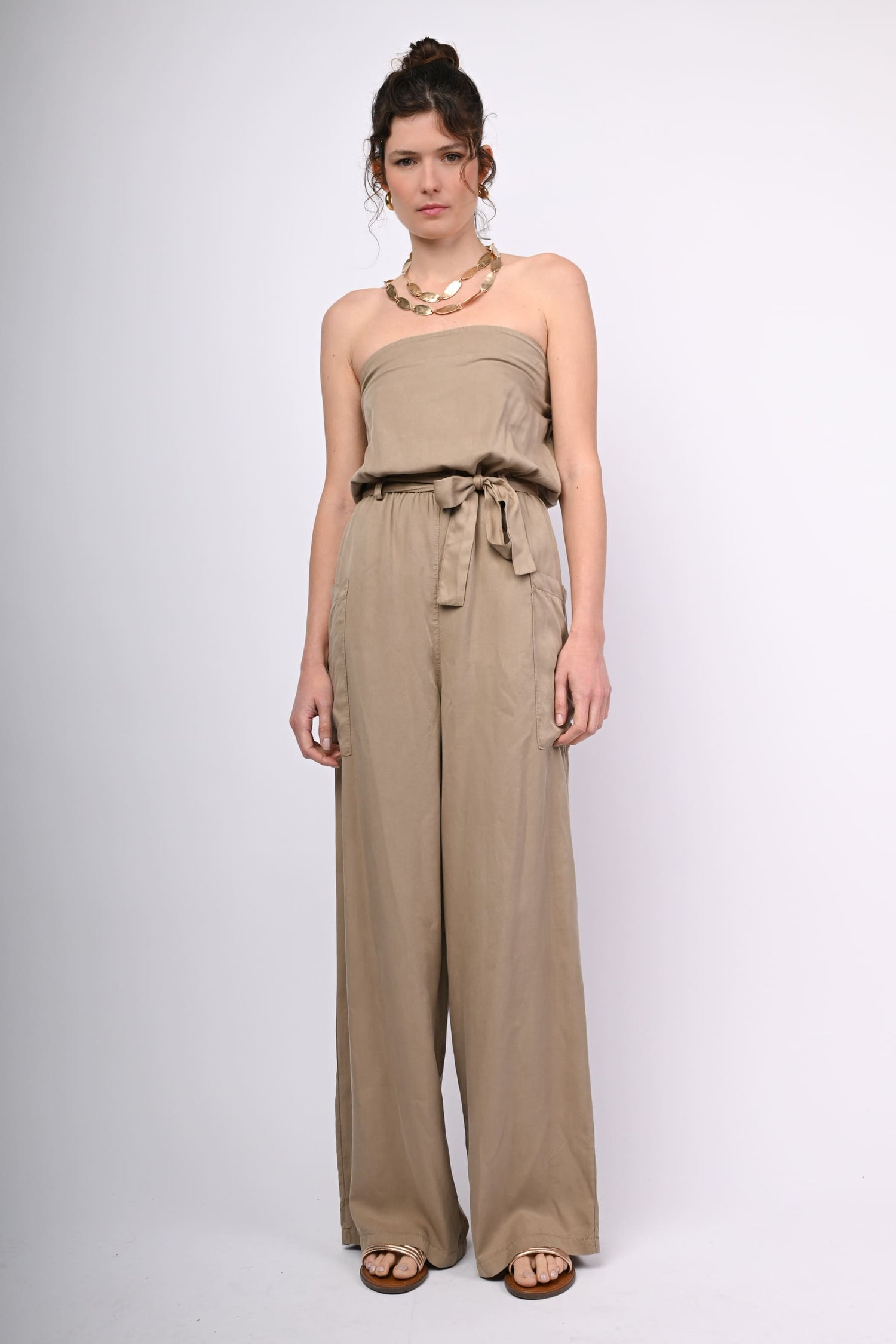 Tuta a fascia in lyocell beige con vita elasticizzata, cintura coordinata da annodare, tasconi laterali e gamba ampia e dritta.